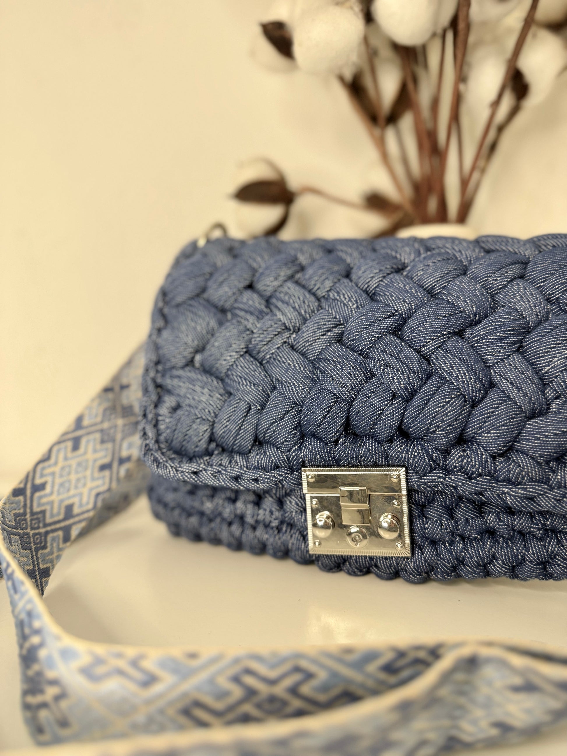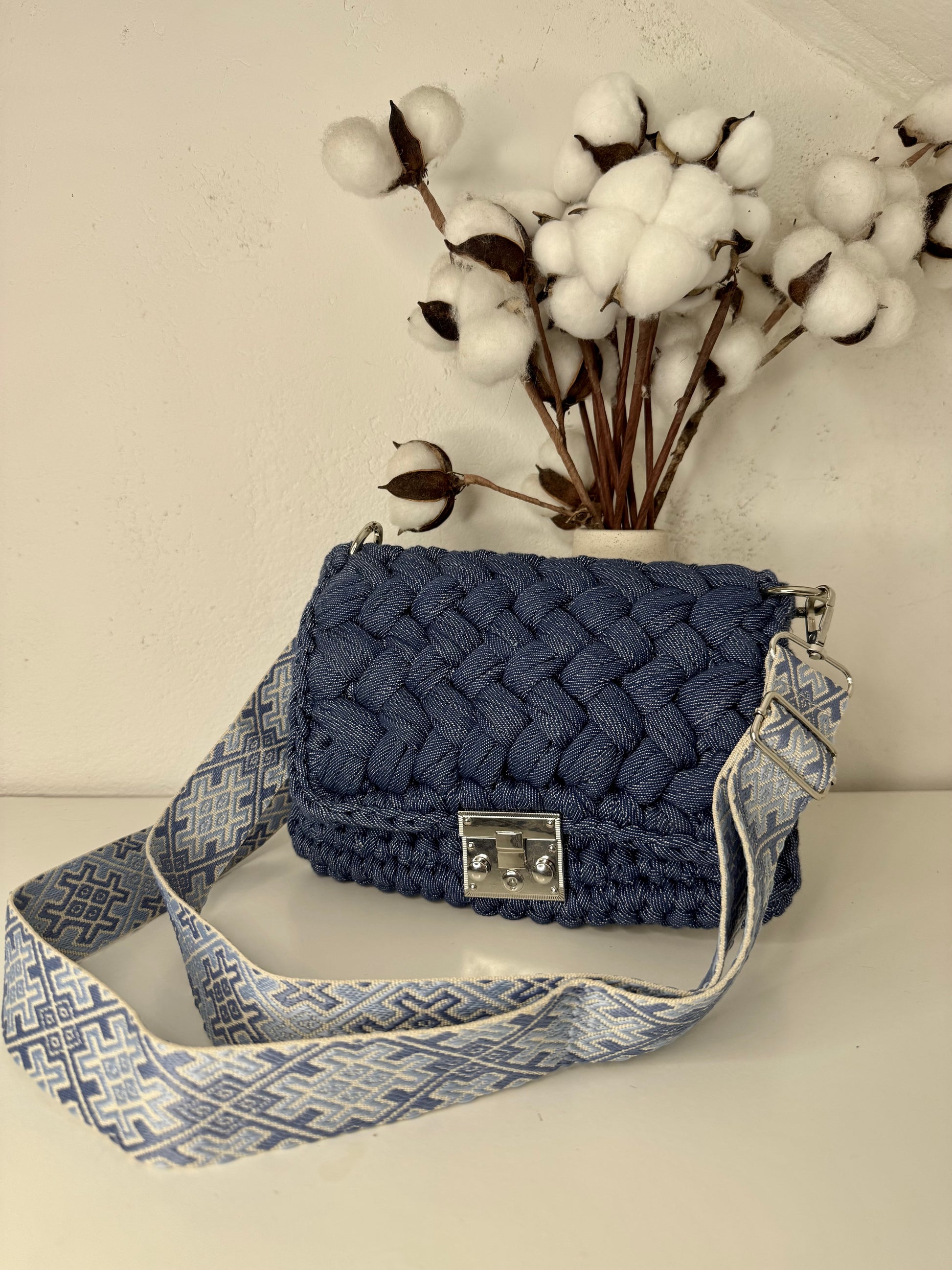 Kvačkana torbica Sky, z všito podlogo za trajnostno zaščito in uporabo. Torbica je ročno pletena iz recikliranega blaga velikih tekstilnih industrij, ki je pretežno bombaž z deležem elastana. Srebrno zapiralo in dolg pas za nošenje čez ramo, dodata piko na i torbici.