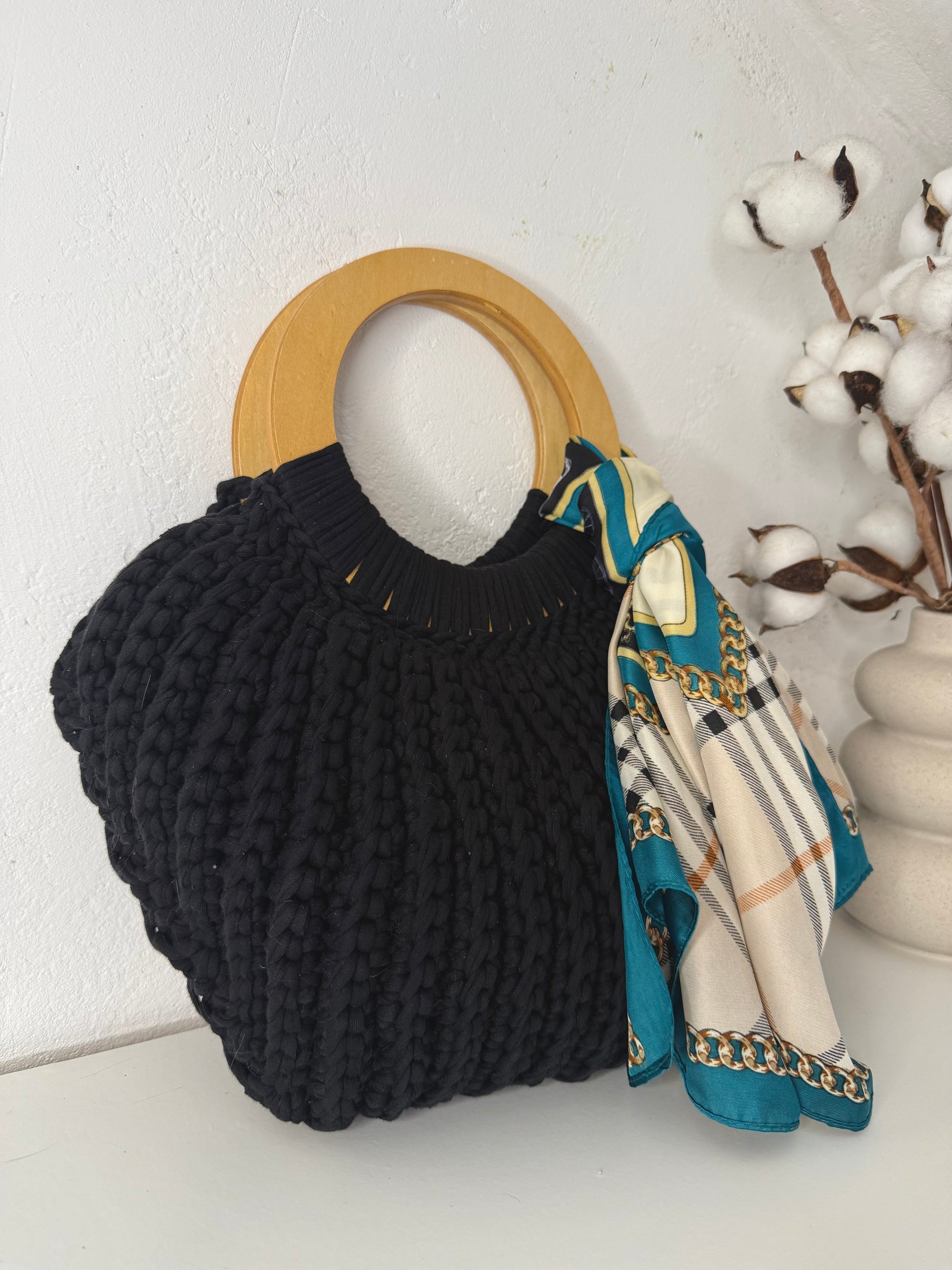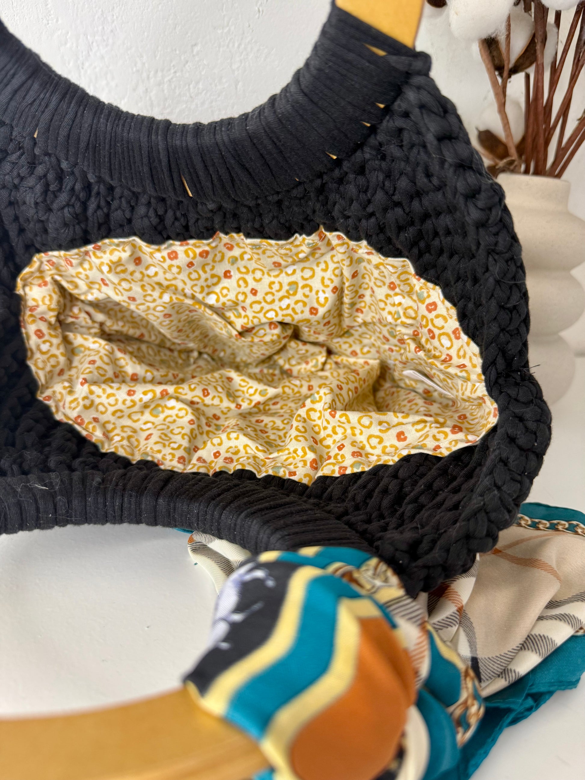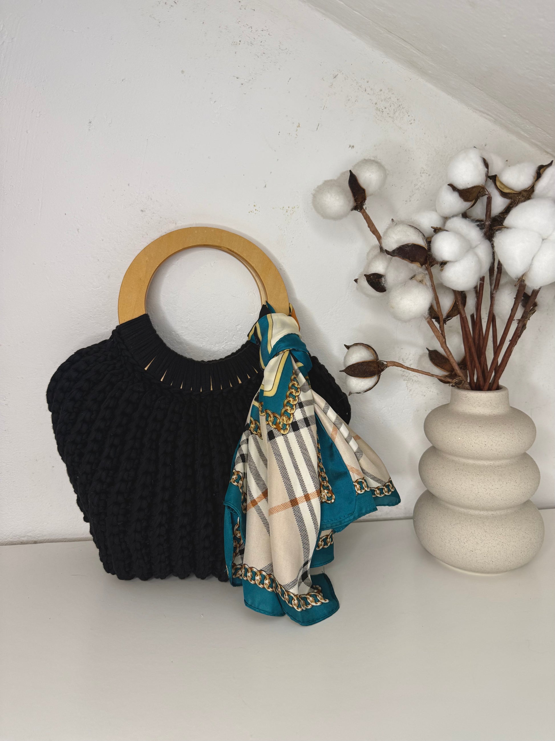Kvačkana torbica Kaia, z všito podlogo za trajnostno zaščito in uporabo. Torbica je ročno pletena iz recikliranega blaga velikih tekstilnih industrij, ki je pretežno bombaž z deležem elastana. Ima lesene ročaje in rutko ki popestri celotno torbico.