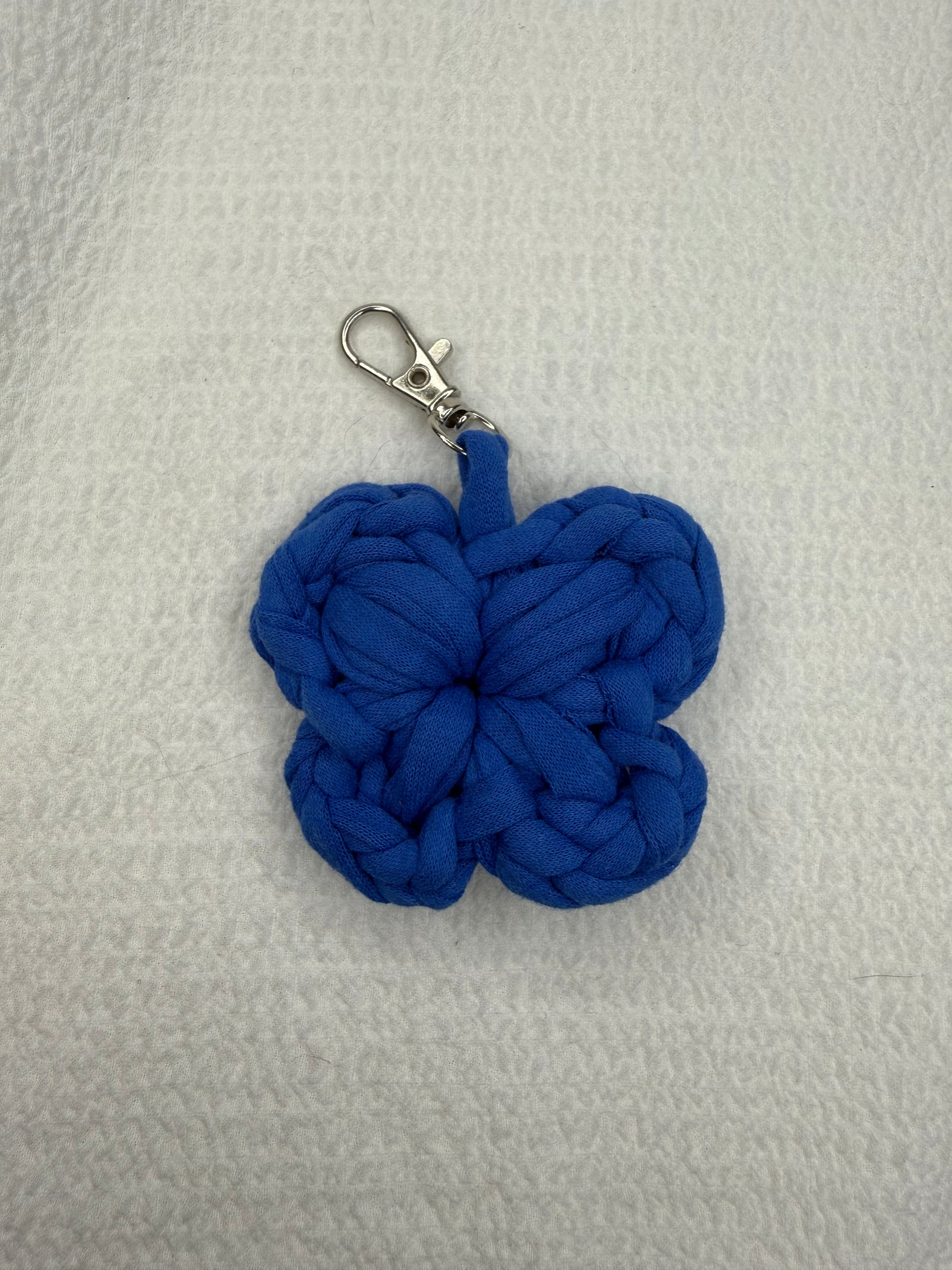 Kvačkan obesek modre barve. Ročno pleteno iz recikliranega blaga velikih tekstilnih industrij, ki je pretežno bombaž z deležem elastana.