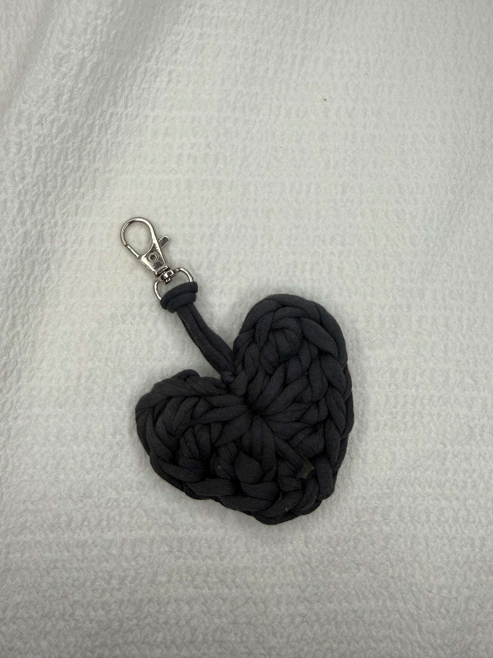 Kvačkan obesek temno sive barve. Ročno pleteno iz recikliranega blaga velikih tekstilnih industrij, ki je pretežno bombaž z deležem elastana.