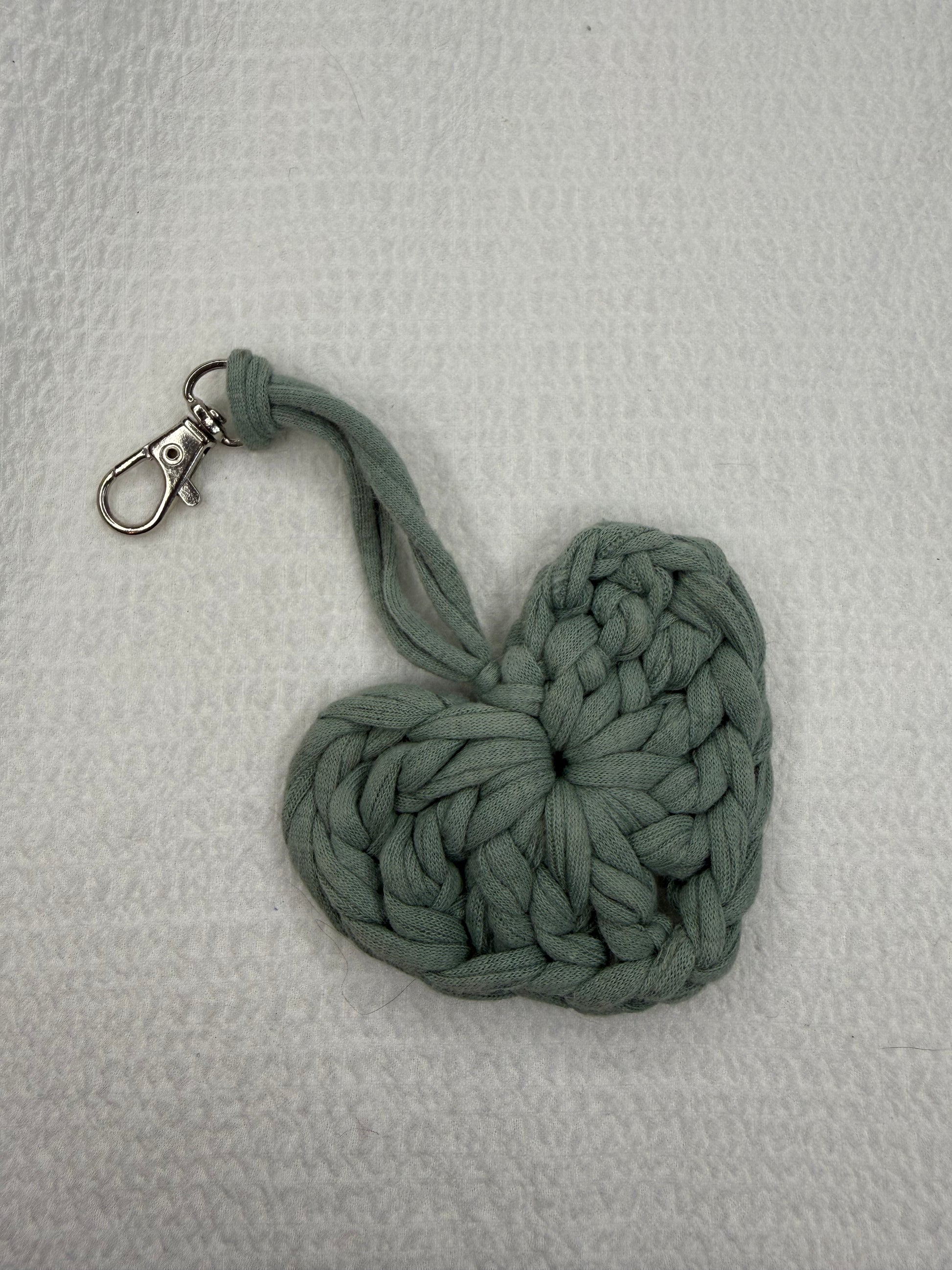 Kvačkan obesek mint zelene barve. Ročno pleteno iz recikliranega blaga velikih tekstilnih industrij, ki je pretežno bombaž z deležem elastana.