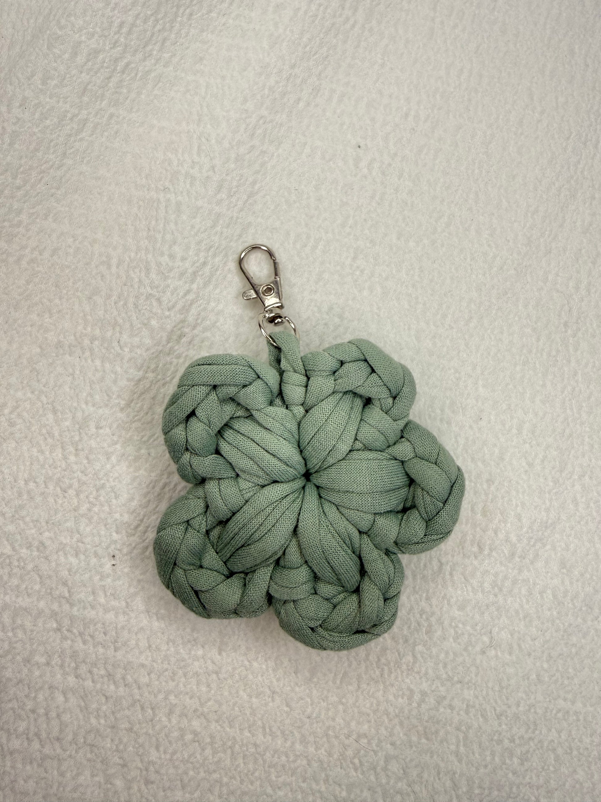 Kvačkan obesek mint zelene barve. Ročno pleteno iz recikliranega blaga velikih tekstilnih industrij, ki je pretežno bombaž z deležem elastana.