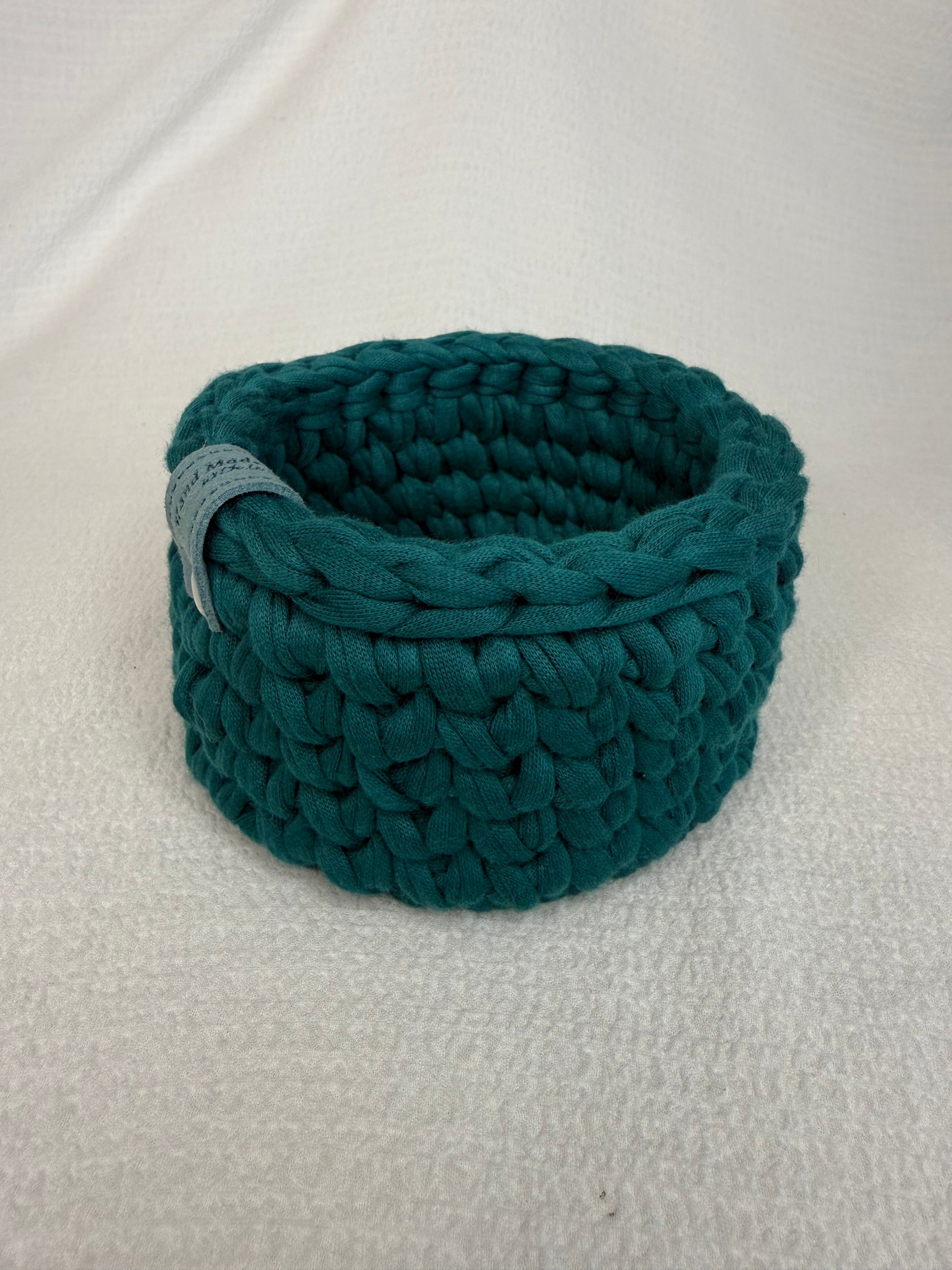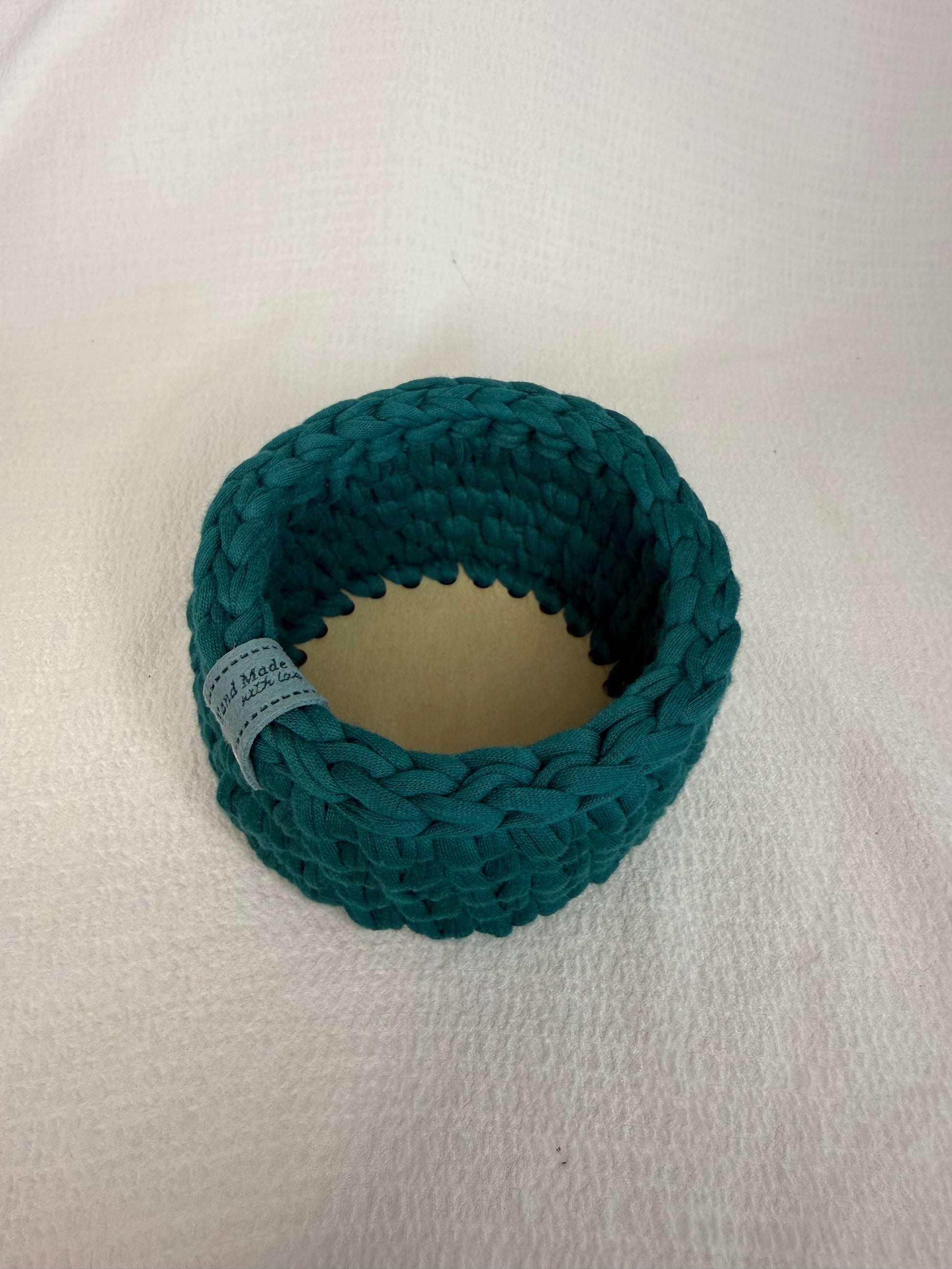 Kvačkana košarica z lesenim dnom v turkizno zeleni barvi.