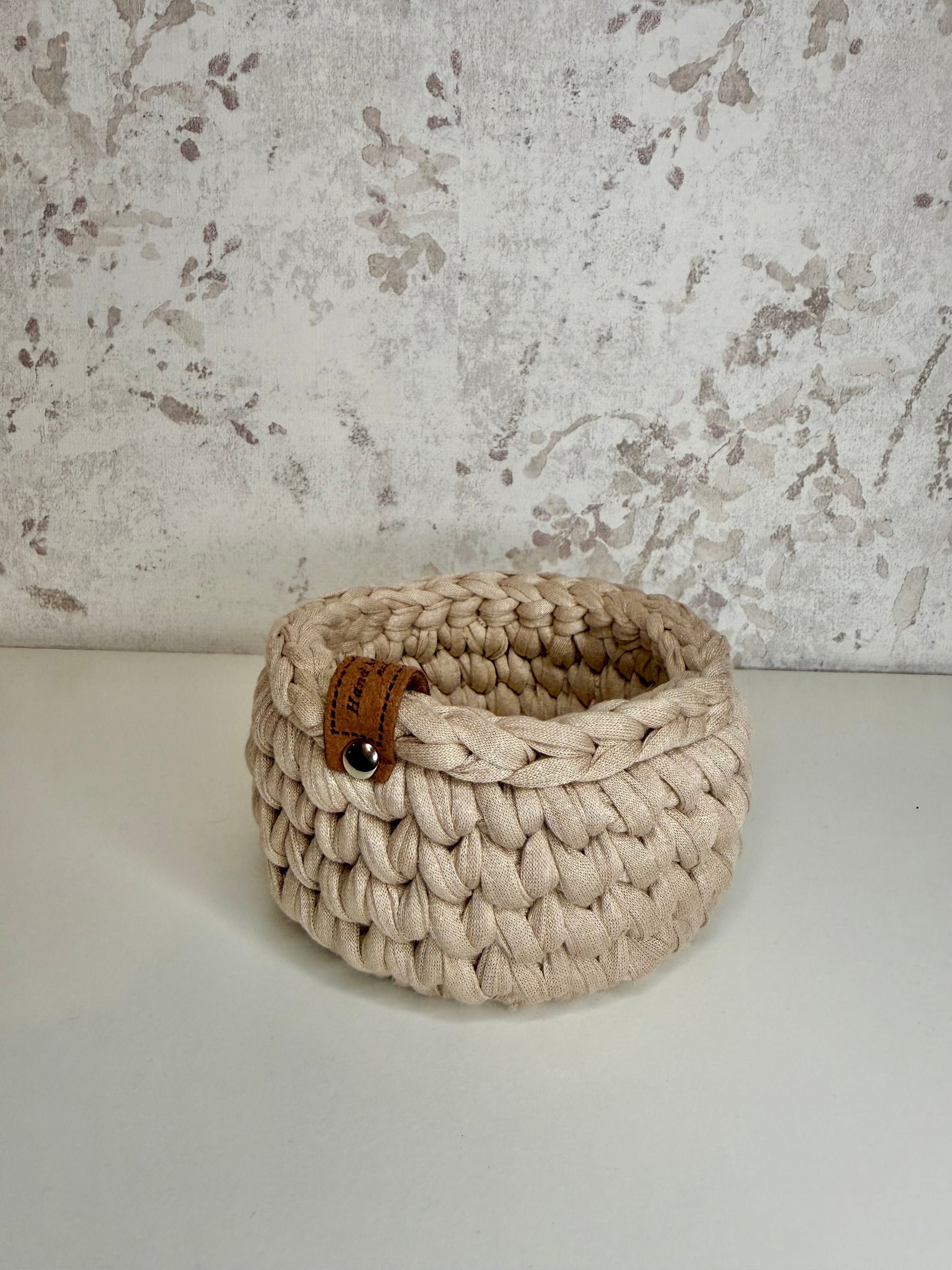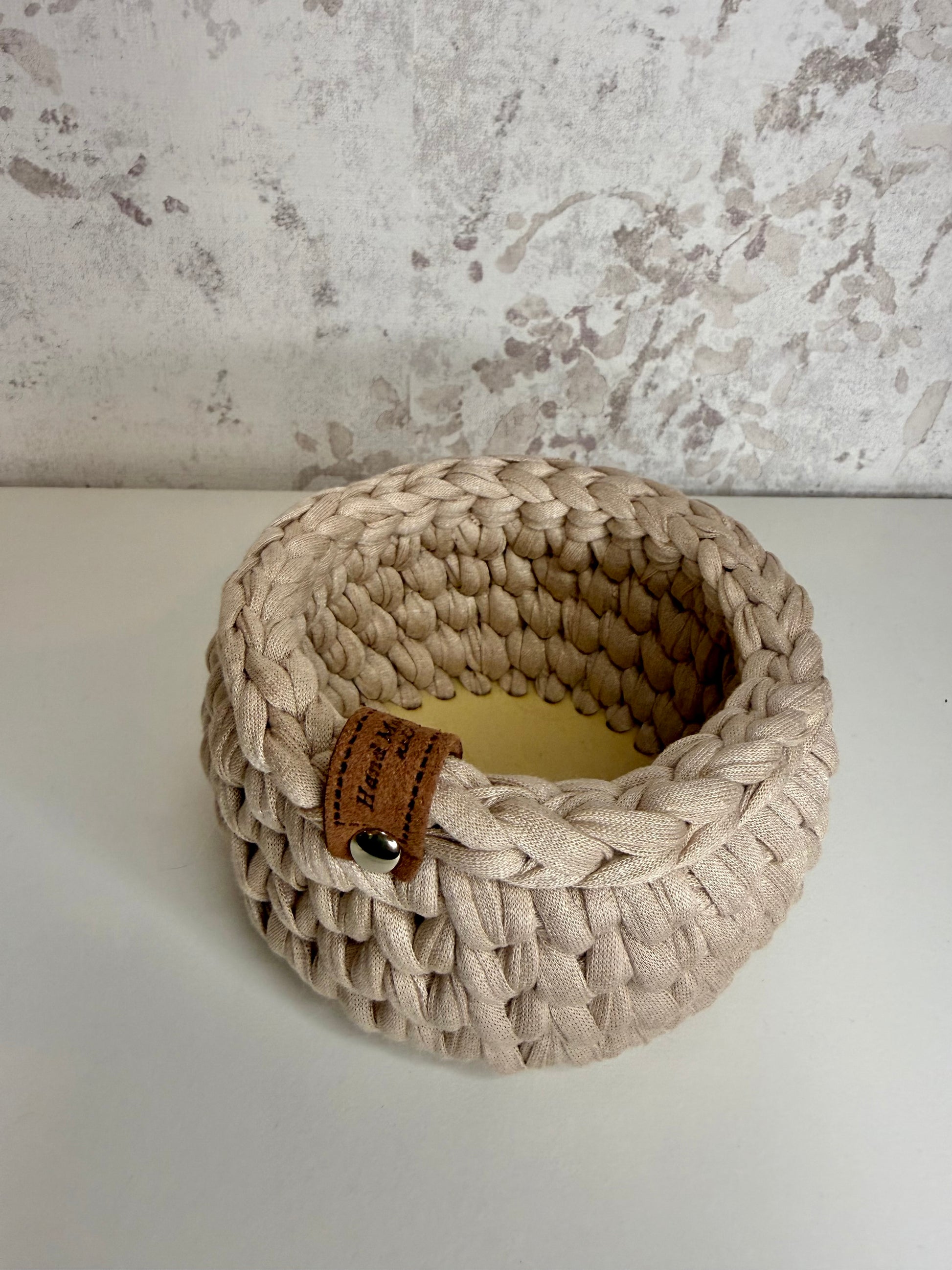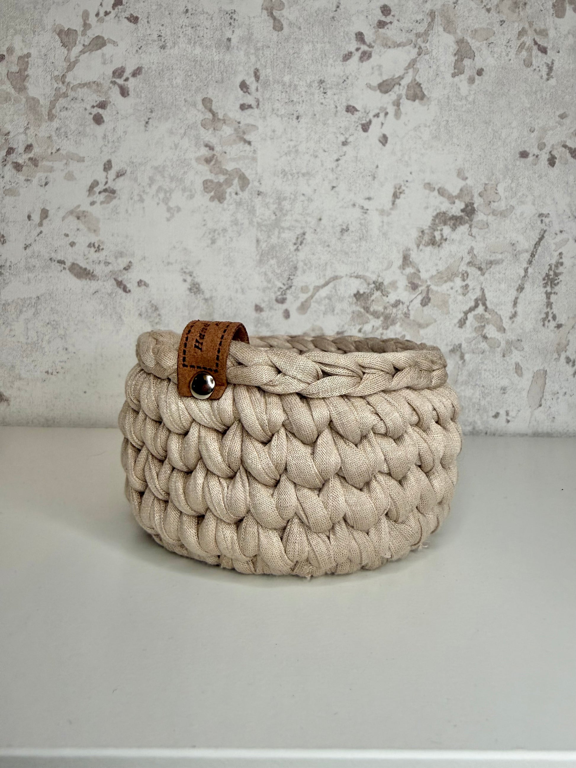 Kvačkana košarica z lesenim dnom v bežbarvi.