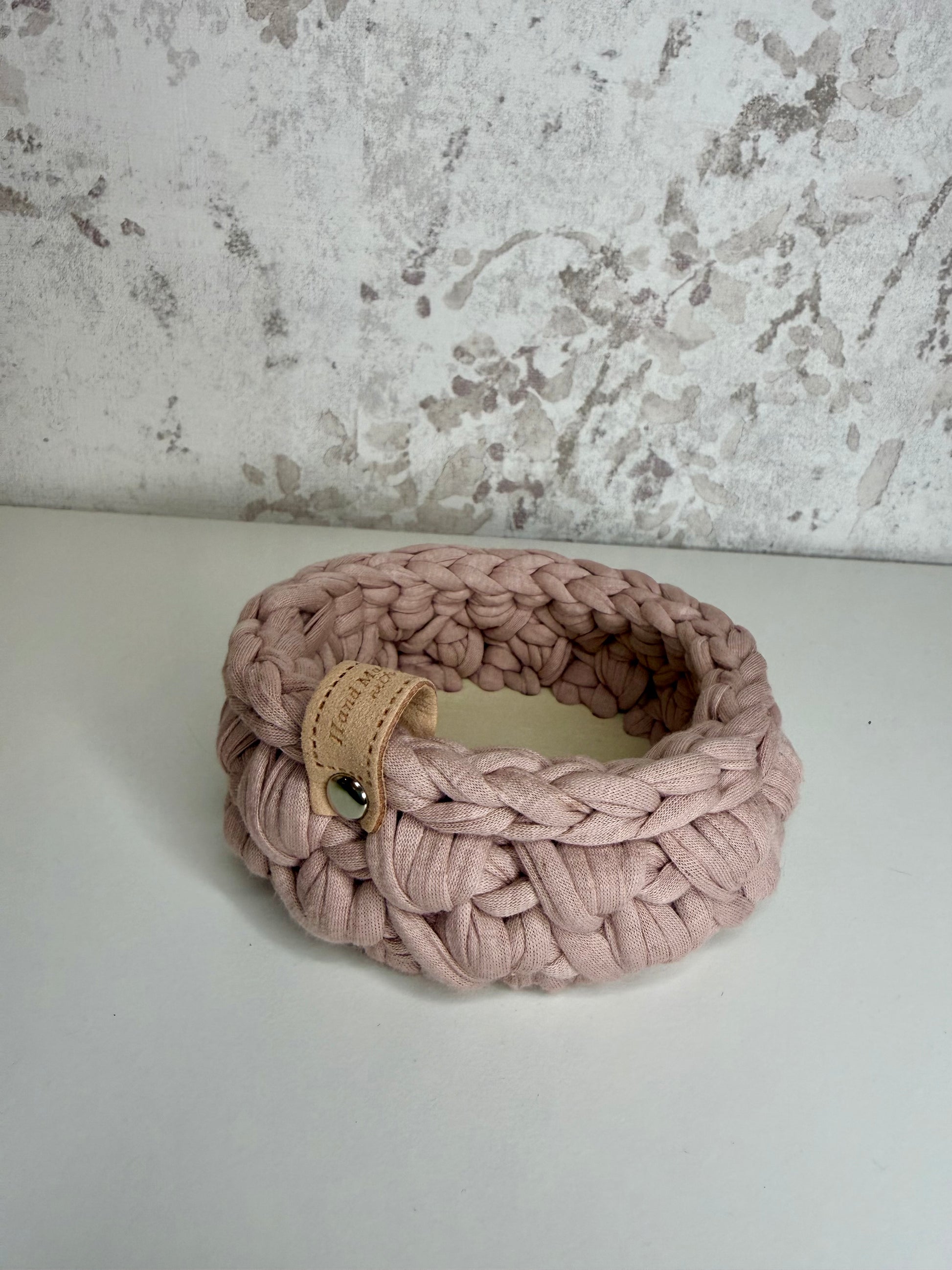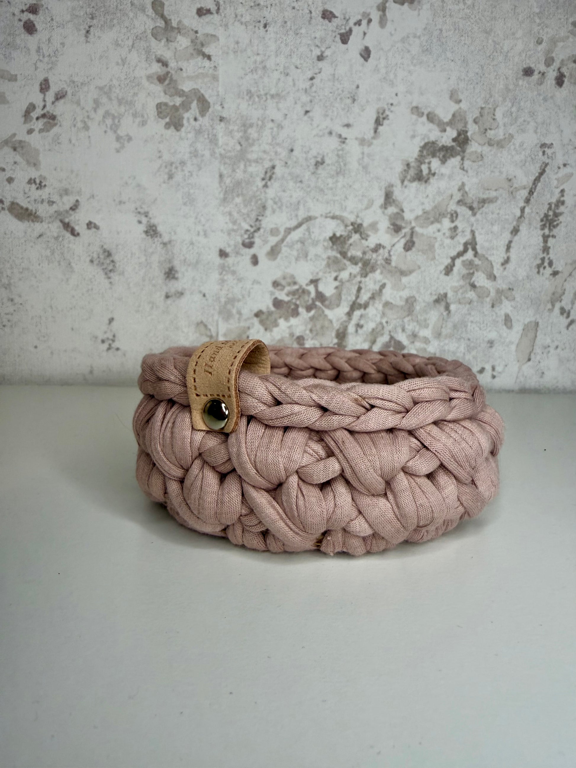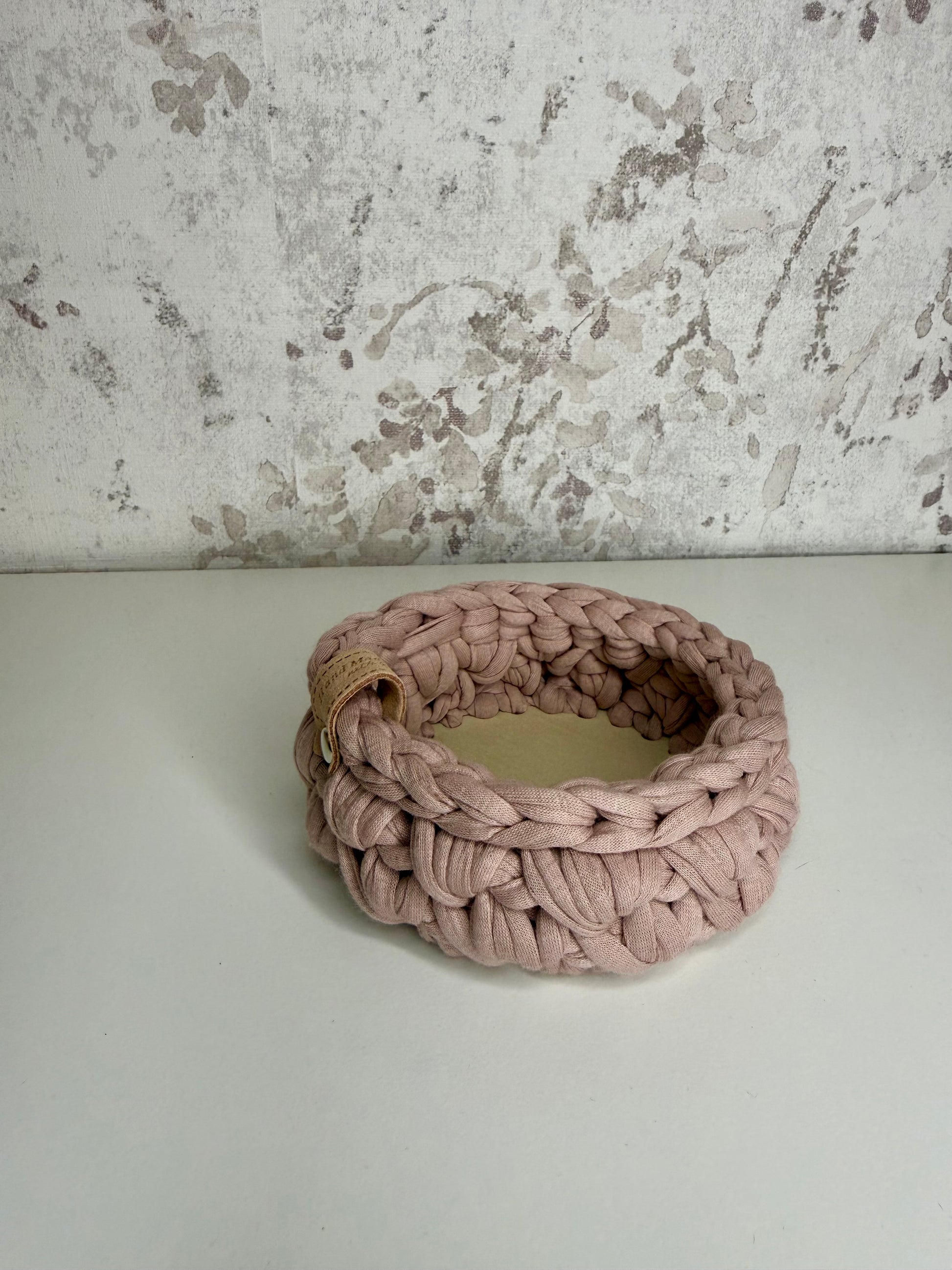 Kvačkana košarica z lesenim dnom v roza barvi.