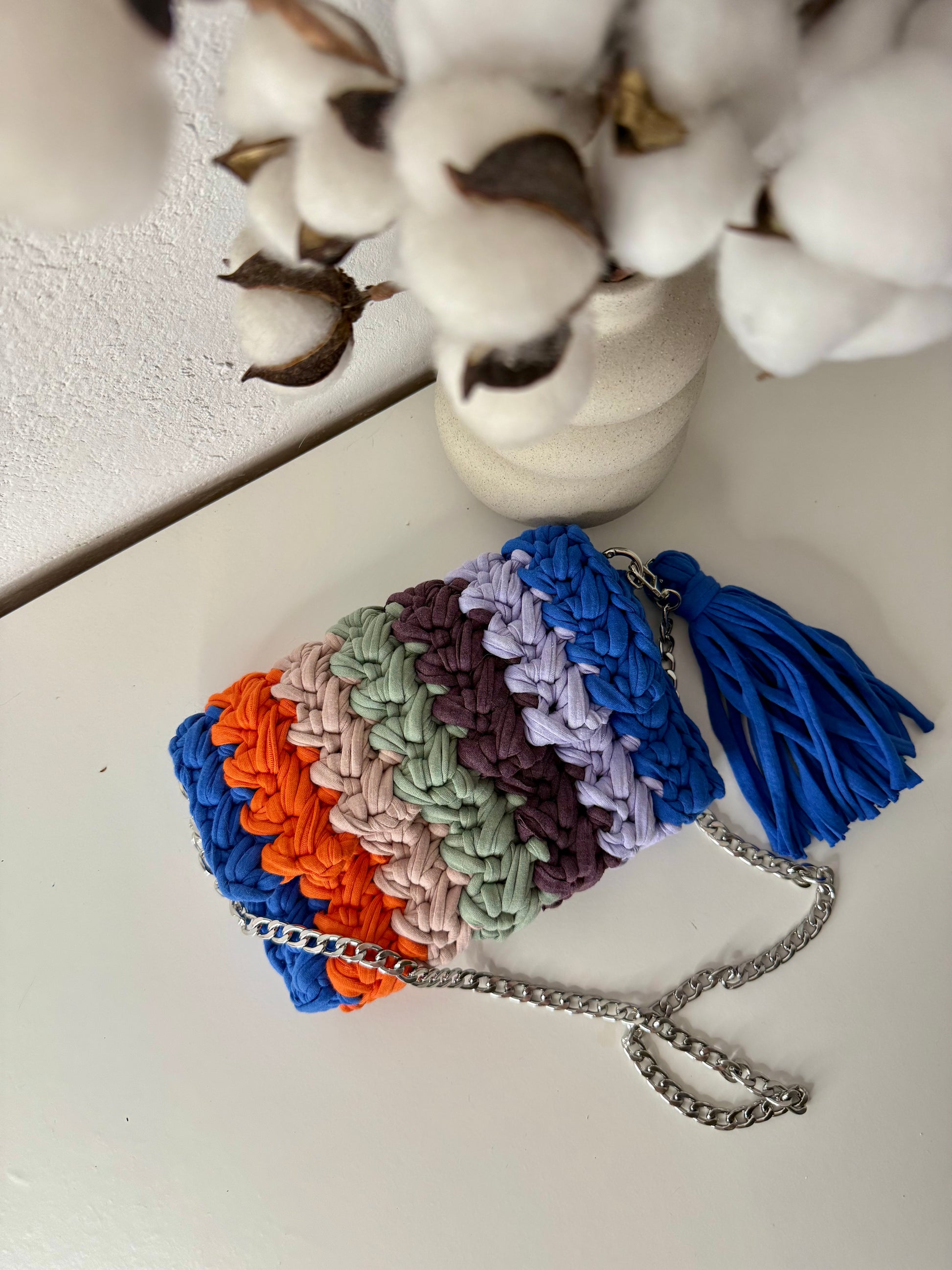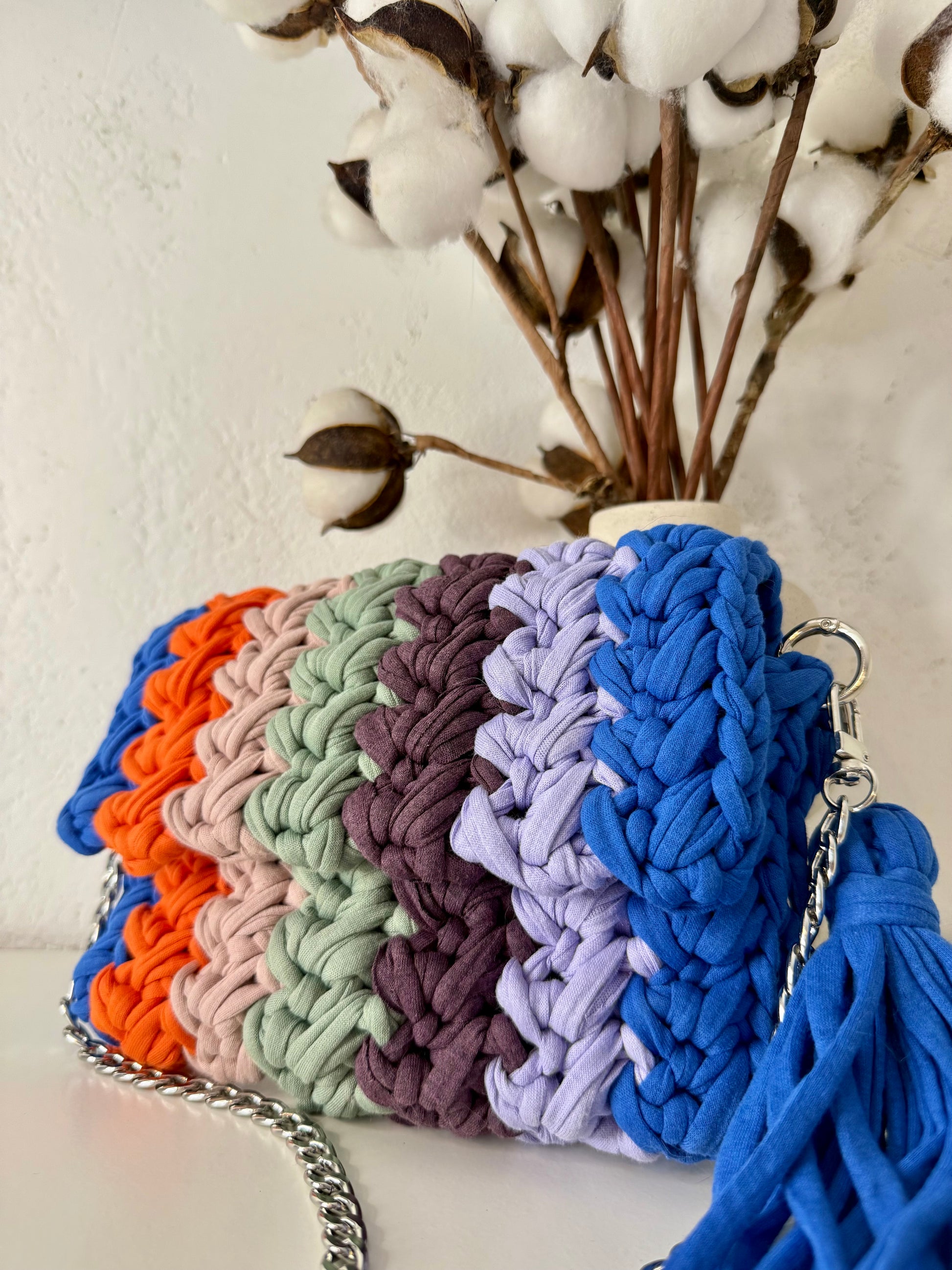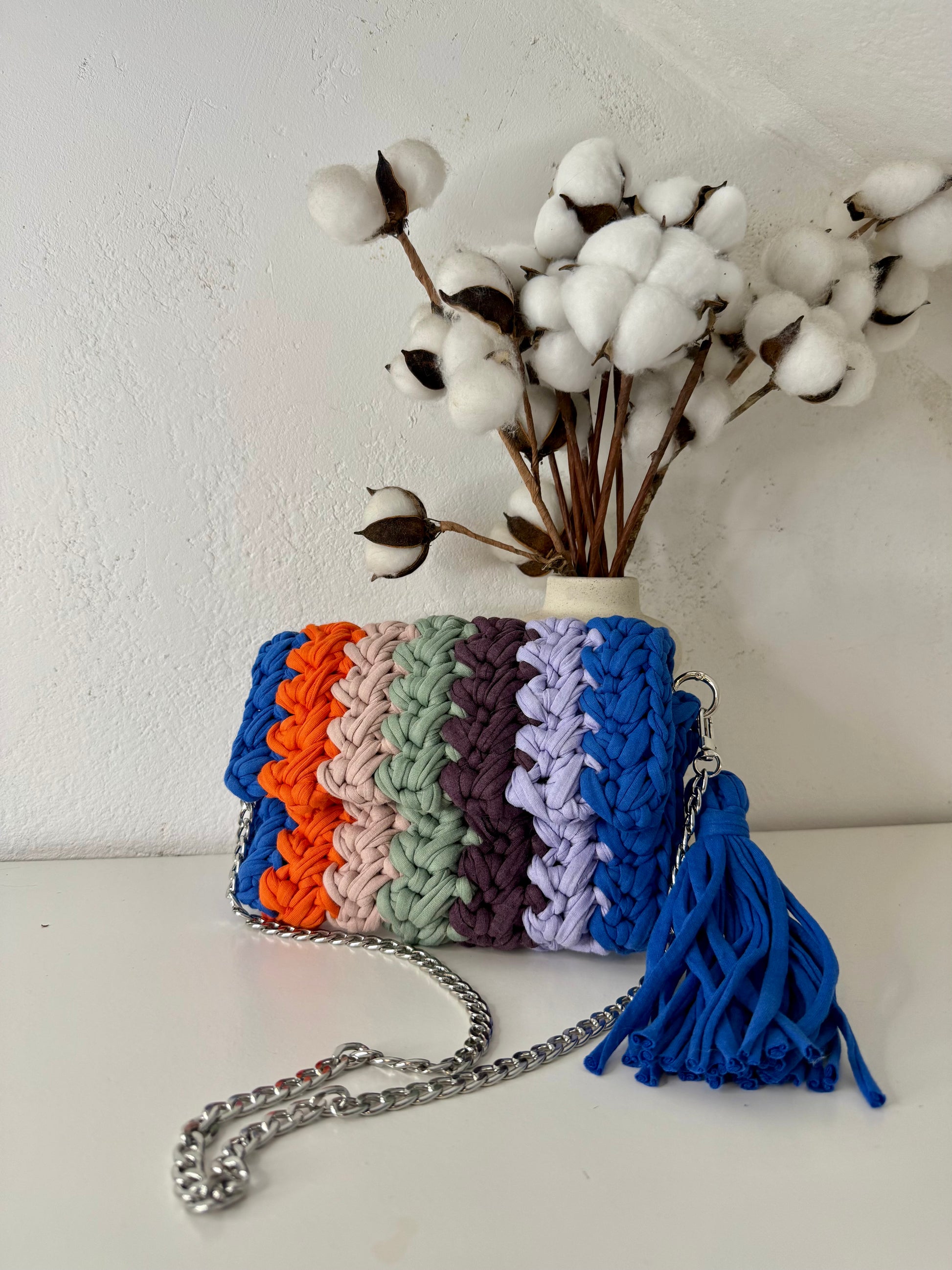 Kvačkana torbica Rainbow, z všito podlogo za trajnostno zaščito in uporabo. Torbica je ročno pletena iz recikliranega blaga velikih tekstilnih industrij, ki je pretežno bombaž z deležem elastana. Preprosto pisano torbico krasi ketnica, za nošenje čez ramo.